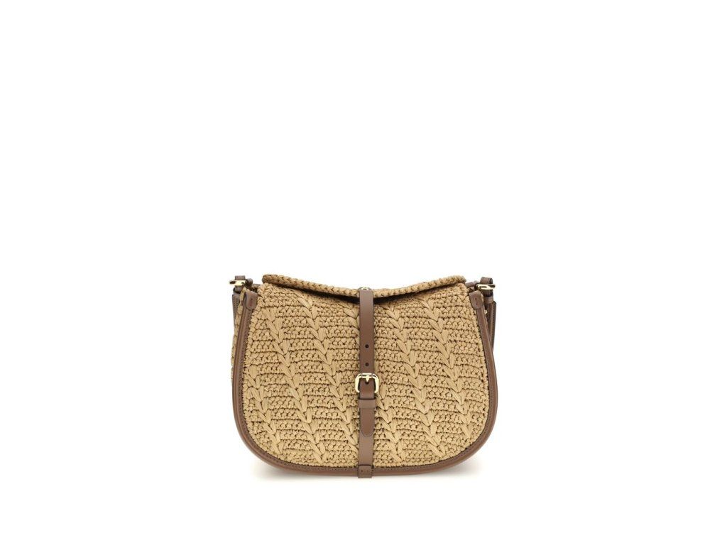 The Pony Shoulder Bag in crochet raffia by Etro expresses refined boho elegance. Featuprsten a double closure, it features a magnetic button decorated with the Pegasus metal coin and a secondary closure with a functional buckle. The model includes interchangeable handle and shoulder strap for hand, shoulder or crossbody carry, enhanced by Paisley detail on the snap hooks. A practical interior wall pocket completes the design.