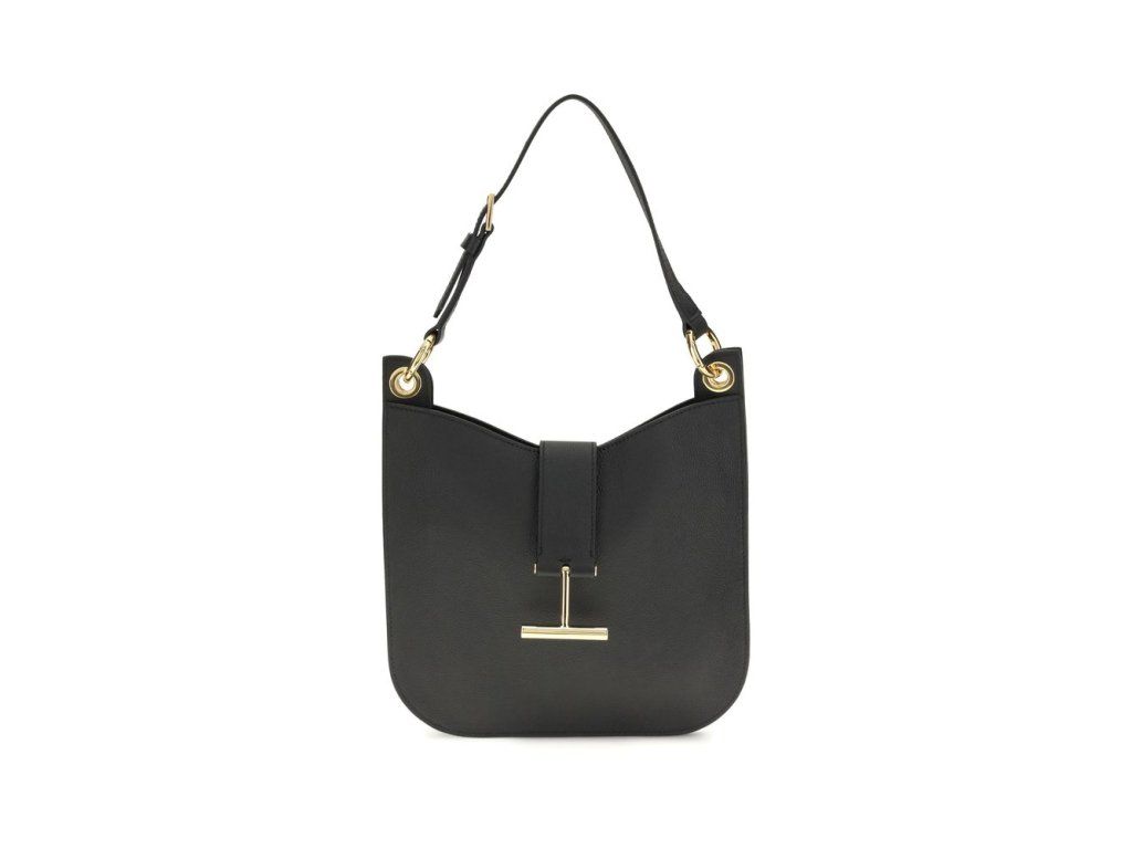 Taška přes rameno Tara z teletiny od Toma Forda, odnímatelný horní popruh nastavitelný kovovou přezkou, design zrnité kůže, detail loga na horním systému zapínání, zapínání na magnetický knoflík, vnitřek s podšívkou, pozlacený kovový hardware.