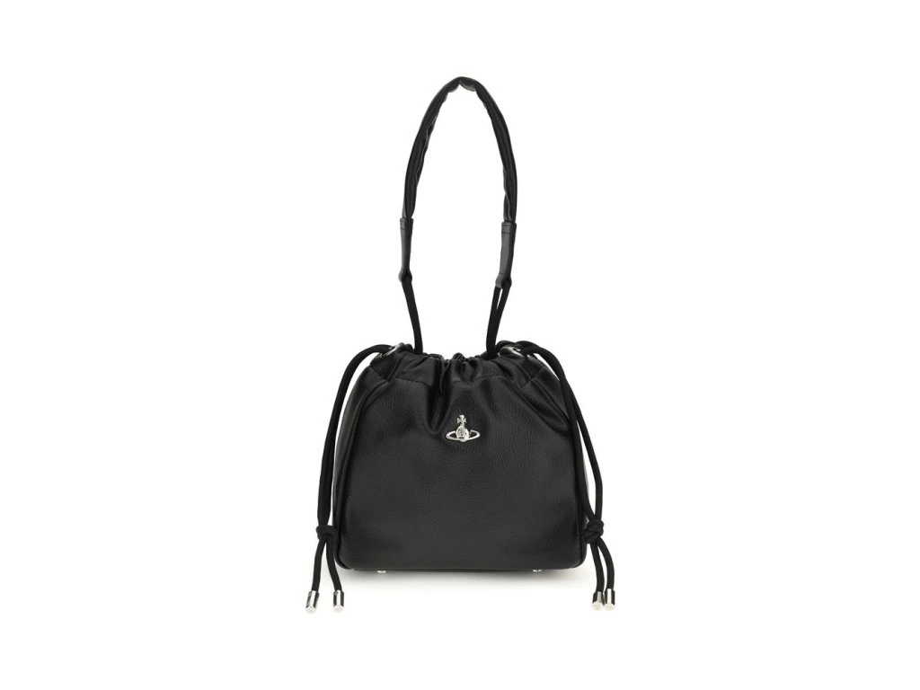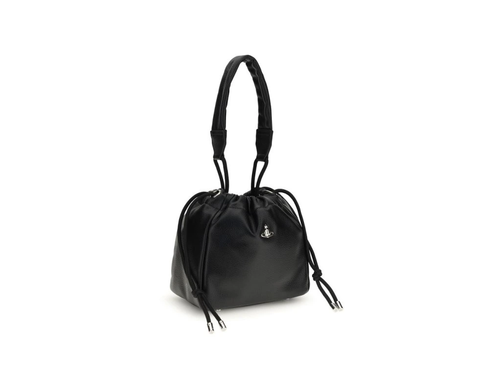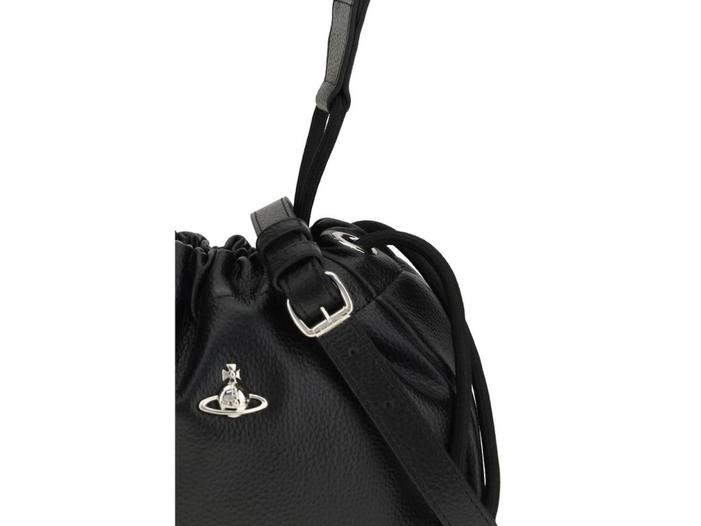 The Hilary Bucket Bag by Vivienne Westwood, crafted from grained synthetic leather, combines functionality and style in a distinctive design. The metal Orb logo embellishes the front, while the drawstprsten closure ensures practicality. Featuprsten a flat handle and removable, adjustable shoulder strap, the fabric-lined interior with logo offers organization and sophistication for all your essentials.