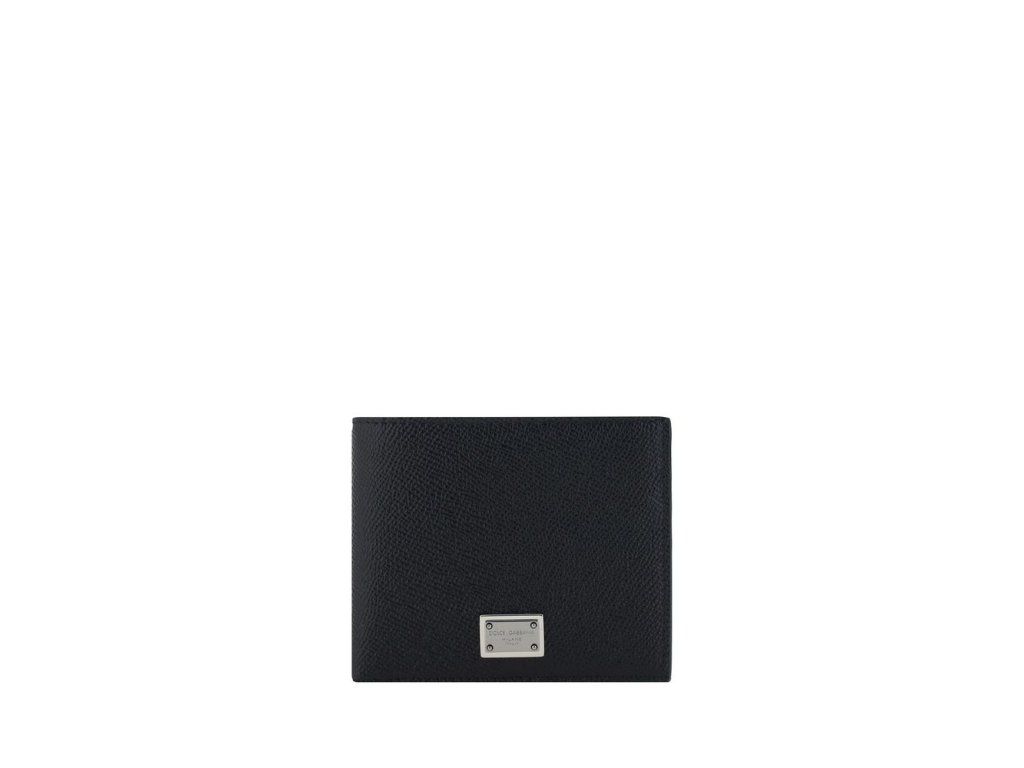 Peněženka z teletiny od Dolce&Gabbana, design bankovky, kovová plaketa s vyraženým ikonickým monogramem značky na přední straně, design zrnité kůže, uvnitř přihrádka na kartu, kompartpánskýt bankovky.