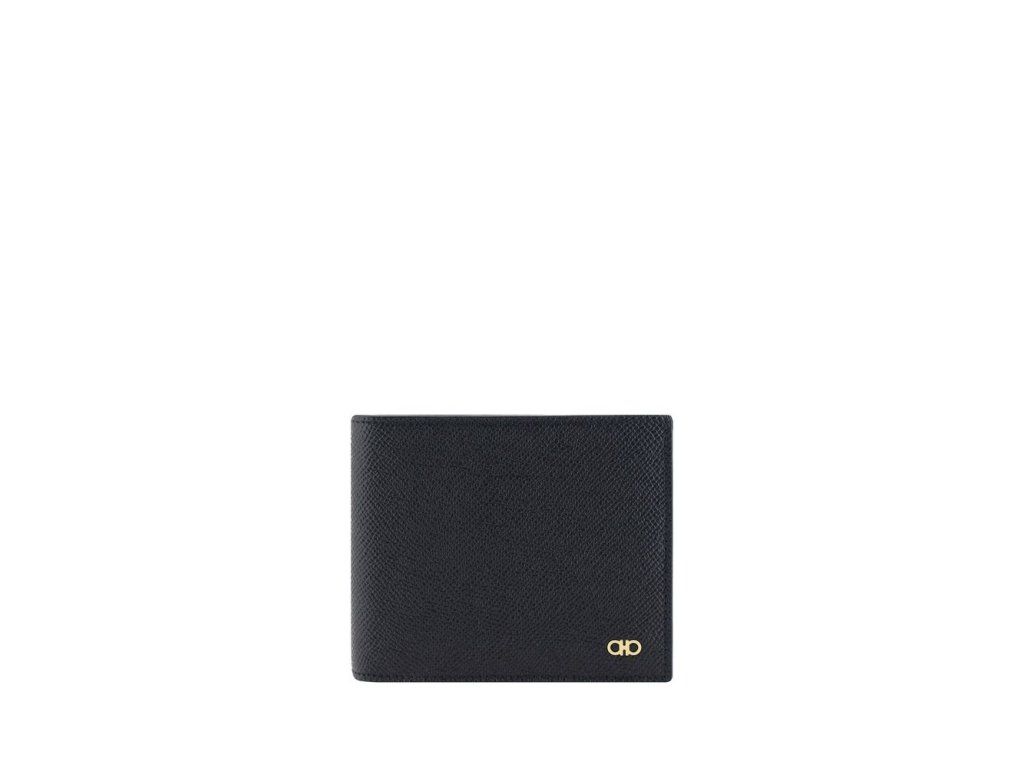 Peněženka z telecí kůže Ferragamo, model billfold, design zrnité kůže, kompartpánskýt na bankovky, vnitřní slot na karty, ikonický monogram značky vyražený na vnitřním panelu, vpředu aplikovaná třídipánský ikonická plaketa s logem značky Gancini.