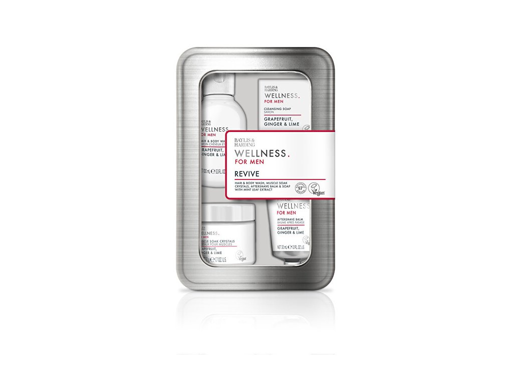 Sada obsahuje: Mycí gel na tělo a vlasy 2v1 100 ml Krystaly do koupele 50 g Balzám po holení 30 ml Tuhé mýdlo 25 g Mycí gel na tělo a vlasy 2v1Praktický mycí gel s rostlinnými extrakty pečuje o pokožku těla i hlavy. Vlasy zanechává přirozeně lesklé a hebké na dotek, zatímco tělo zahalí energickou, svěží vůní.Použití: Naneste na vlhkou pokožku a vlasy, napěňte a důkladně opláchněte. Krystaly do koupeleVoňavé krystalky s mátovým a zázvorovým extraktem dodají koupeli nový rozměr. Provoní celou lázeň, uvolňují tělo a svaly a zanechají pokožku hebkou a hladkou na dotek.Použití: Nasypte do teplé vodní lázně, ponořte se do smyslné vůně a relaxujte. Balzám po holeníOsvěžující balzám dopřeje pokožce tu nejlepší péči po holení. S obsahem bambuckého a kakaového másla zklidňuje podrážděnou pokožku, hydratuje a předchází zarudnutí a svědění. Zanechá hebkou a příjemně provoněnou pokožku vůní grapefruitu, zázvoru a eukalyptu.Použití: Malé množství balzámu naneste do dlaní a rovnoměrně rozetřete na oholenou oblast. Tuhé mýdloTuhé mýdlo s mátovým extraktem odstraňuje nečistoty z pokožky rukou bez nepříjemného vysušování. Vytváří bohatou pěnu a zanechává dlouhotrvající svěží vůni.Použití: Promněte ve vlhkých dlaních, napěňte a opláchněte. Grapefruit, Zázvor & LimetkaMinimalistická kolekce Wellness For Men představuje komfortní péči o celé tělo z pohodlí Vašeho domova, s pečlivě vybranými produkty s přírodním složením určenými pro muže. Celou kolekci provází svěží, energická vůně a extrakt z kořene zázvoru, který je známý pro své antioxidační a protizánětlivé účinky. Pouze pro vnější použití. Vyhněte se kontaktu s očima a očním okolím. Při jakýchkoliv známkách podráždění přestaňte používat. Vegan & Cruelty-FreeDoplňkové parametry