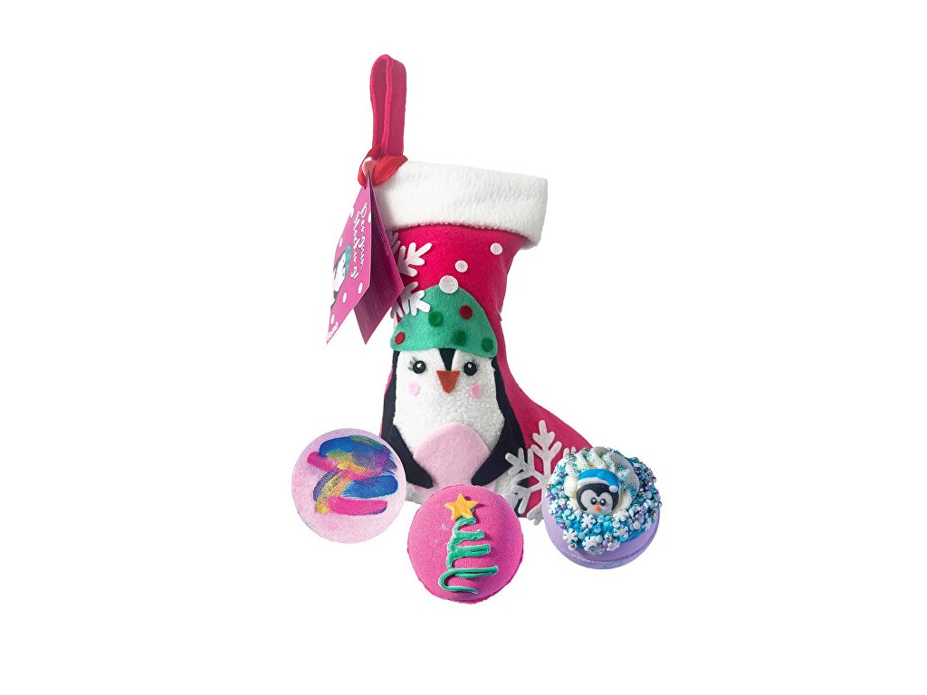 Sada Penguin Stocking s motivem tučňáka obsahuje voňavé dárky, které vás potěší a uklidní po náročném dni, plném vánočních nákupů. Skočte si do relaxační vany a sledujte, jak vaše starosti mizí. Sada obsahuje: Šumivá koule do koupele 3 ks Aktivní látky: přírodní esenciální oleje. Vlastnosti: hydratuje a zvláčňuje pokožku, uvolňuje tělo, duši i mysl, přináší jedinečný zážitek z každé koupele, ručně vyrobené, obsahuje přírodní suroviny. Jak používat: Vhoďte do teplé vodní lázně. Upozornění: Nevhodné pro děti do 3 let. Nejedná se o potravinu, uchovávejte mimo dosah dětí. Pouze pro zevní použití. Zabraňte kontaktu s očima. Při zasažení očí okamžitě důkladně vypláchněte vodou.Doplňkové parametry