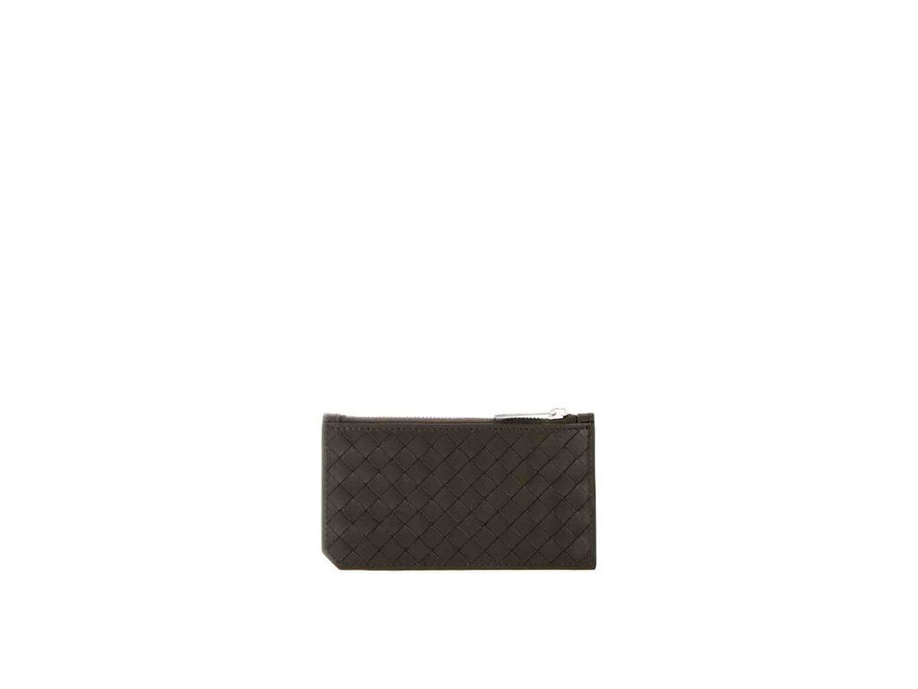 \n– Složení: 100% teletina – Motiv Intrecciato vpředu – Reliéfní logo vzadu – Stříbrný kovový povrch – Horní kapsa na zip – Tři přihrádky na kreditní karty – Made in Italy – Pohlaví: MUŽI –