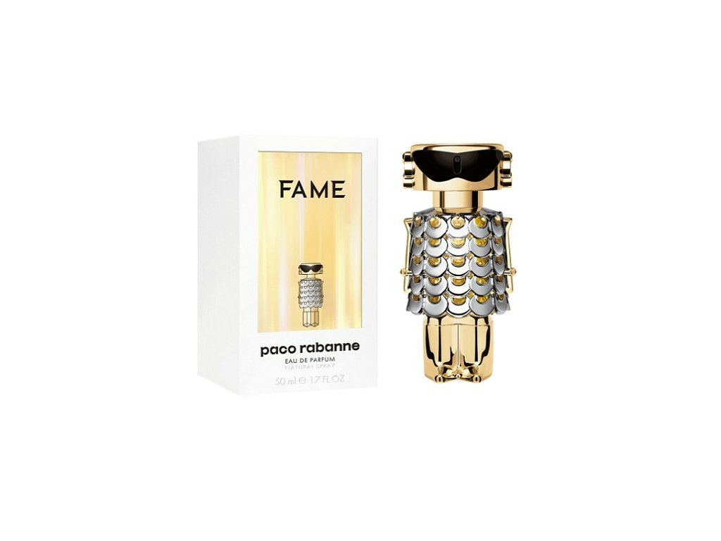 Fame, nová ženská vůně od Rabanne, zachycující neodolatelného ducha Paříže. Fame je oddaností nové éře ženskosti. Je esencí avantgardního luxusu, ztělesněného v citrusové vůni bergamotu, sladkého šťavnatého manga, čistého jasmínu a lahodně smyslného krémového kadidla. V základu se objevuje aroma santalového dřeva, které zjemňuje vanilka. Flakon je vyroben z lesklého plastu ve stříbrné a zlaté barvě a má zachytit okouzlující atmosféru 60. let a přitáhnout mladší generace.Vůně byla uvedena na trh v roce 2022.Varianta 80 ml je plnitelná.Vedlejší vůně - Ovocná