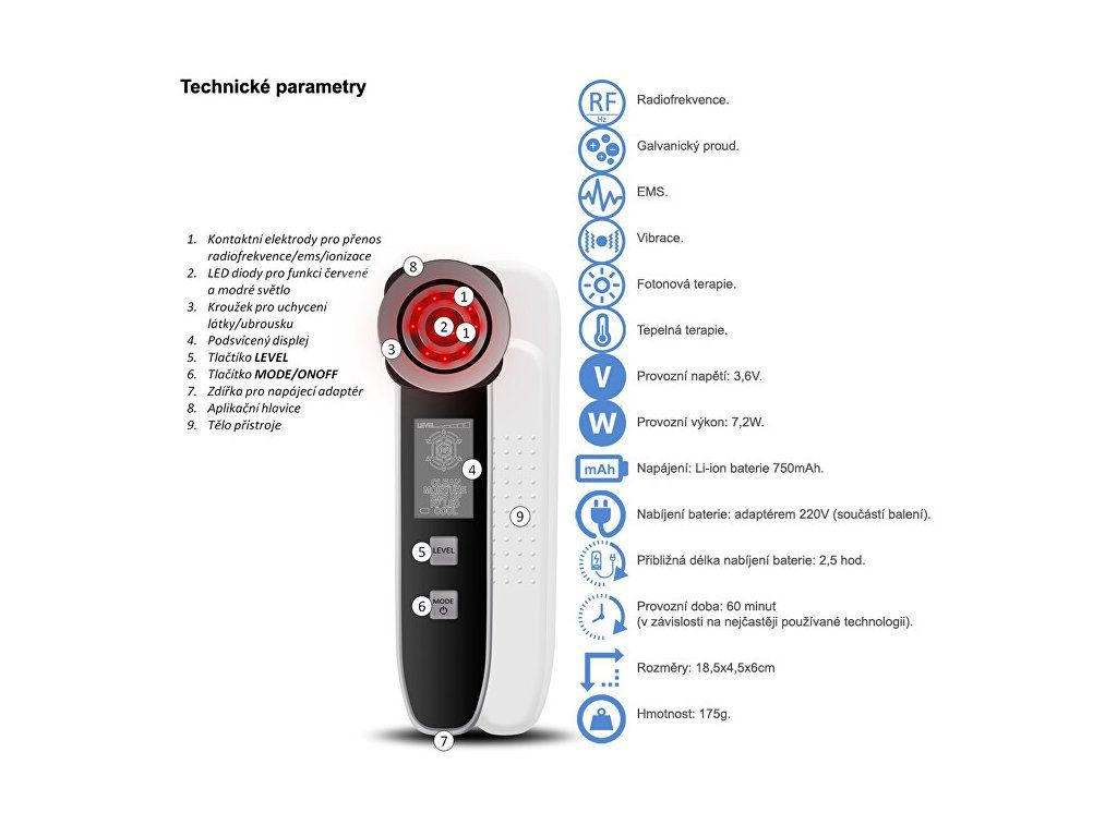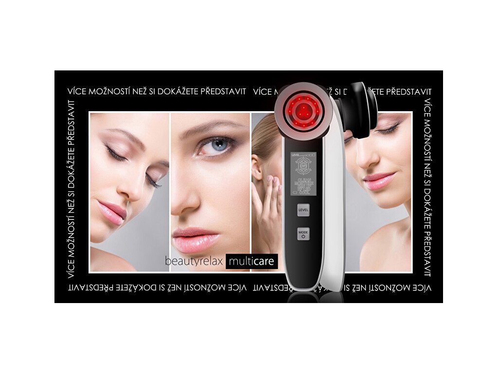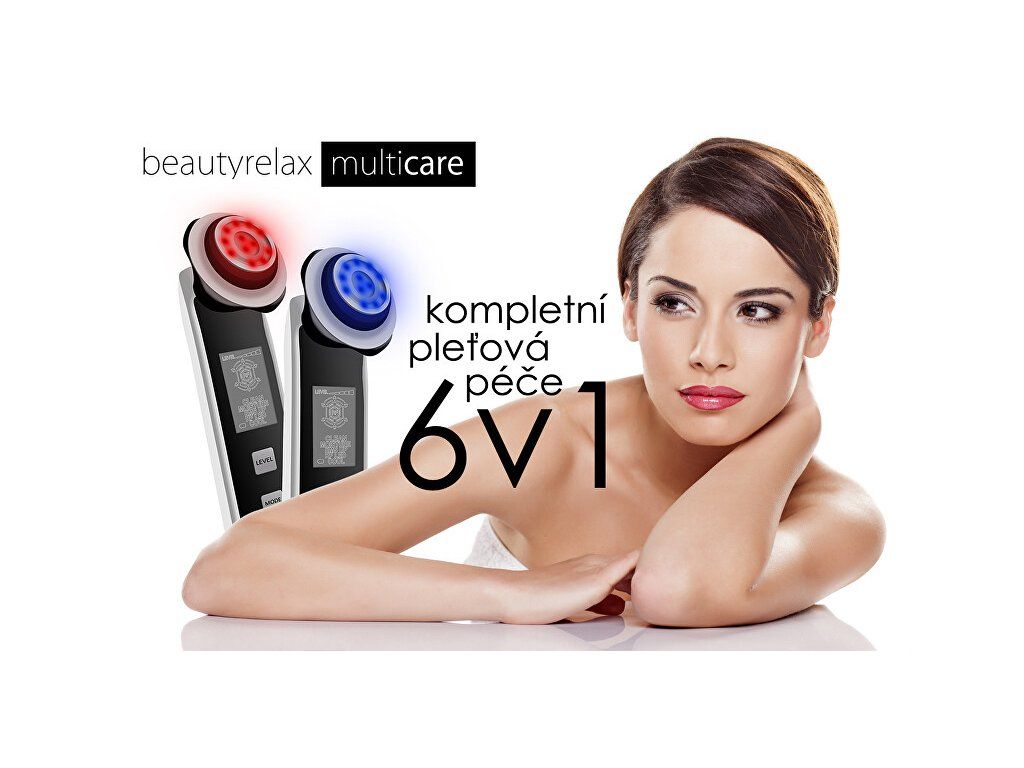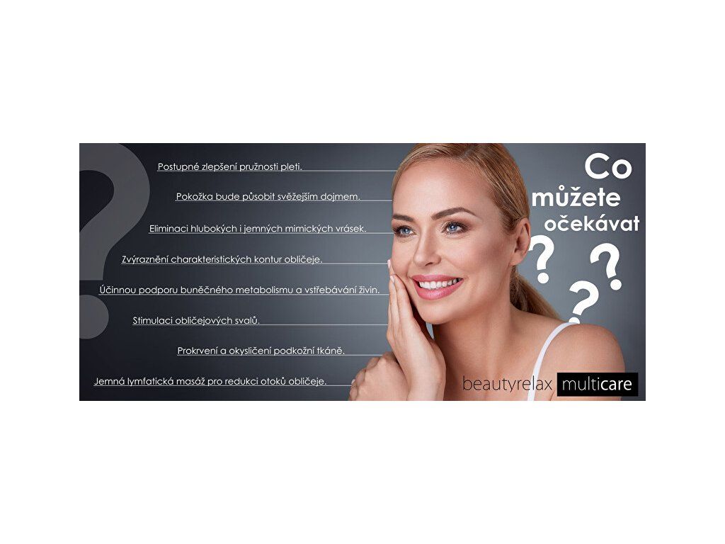 Profesionální kosmetický přístroj k ošetření pleti nabízí moderní technologie, které jsou nejpoužívanější v dermatologii a kosmetickém odvětví. Začněte o pleť pečovat na profesionální úrovni i vy. Co můžete očekávat? Postupné zlepšení pružnosti pleti. Pokožka bude působit svěžejším dojmem. Eliminaci hlubokých i jemných mimických vrásek. Zvýraznění charakteristických kontur obličeje. Stimulaci obličejových svalů. Prokrvení a okysličení podkožní tkáně. Jemná lymfatická masáž pro redukci otoků obličeje. Účinnou podporu buněčného metabolismu a vstřebávání živin. Hlavní výhody Neinvazivní ošetření (přístroj neproniká přímo skrz pokožku). Ošetření bez jakýchkoliv nepříjemných pocitů. Bez nežádoucích trvalých změn pigmentace pleti. Ihned po proceduře lze použít kosmetické přípravky. Bez omezení pokračovat v jakýchkoliv aktivitách (např. před společenským programem). Specifikace 5 automatických programů Multicare s přednastavenými režimy ošetření pleti: Radiofrekvence Aplikační hlavice generuje energii prostřednictvím radiofrekvenčních vln se zcela specifickým výkonem a frekvencí. Radiofrekvenční vlny jsou optimalizovány k tomu, aby způsobily tepelný gradient, který významně ovlivňuje procesy ve vrstvě dermis. Dodaná energie aktivuje remodelaci kolagenových vláken a elastinu. Maximální možné zacílení energie i v lokalitách s výraznější tukovou vrstvou a následná excitace metabolických procesů má významný vliv na velmi efektivní vyhlazení povislých a deformovaných kontur. Galvanický proud Aplikační hlavice vytváří na svém povrchu proud s možností proměnlivého náboje. Řídící jednotka kosmetického přístroje umožňuje úpravu galvanického proudu takovým způsobem, aby docházelo ke kladnému či zápornému náboji. Kladná a záporná ionizace má odlišné účinky na pleť. Kladná ionizace - důkladné vyčištění pleti Kladná ionizace vytáhne záporně nabité nečistoty jako magnet. Zažijete skutečně čistou pleť jako nikdy předtím. Pouze čistá pleť je ta zdravá! Záporná ionizace - hloubkové vyživení pleti Galvanický proud penetruje výživové látky z kosmetických sér hluboko do pokožky. Je zabráněno vyschnutí na povrchu. Absolutní turboefekt pro vaše kosmetické přípravky! EMS Náš obličej je protkaný strukturou svalů. Obličejové svaly jsou zodpovědné za výraz a mimiku. Působením času svaly ztrácí přirozenou pružnost a elasticitu. Pleť působí fádním a unaveným dojmem. Aplikační hlavice BeautyRelax Multicare přenáší při kontaktu s pletí jemné elektrické mikropulzy, které pronikají přes svrchní část pokožky přímo k obličejovým svalům. Výkon a frekvence elektrických pulzů jsou speciálně upraveny tak, aby umožnily účinné, ale zároveň bezbolestné ošetření obličeje. Dochází ke kontrakci svalů a tím jejich posílení. Kolagenní a elastická vlákna jsou mechanicky stimulována. V oblasti obličeje docílíte zlepšení textury pokožky, jejího tónu a nárůstu elasticity. Pleť má omlazený a prozářený vzhled. To vše neinvazivně a bez jakýchkoliv nepříjemných pocitů. Vibrace Správná funkce lymfatického systému platí nejen pro tělesné končetiny, ale také pro náš obličej. Pokud máme lymfu a krevní oběh v pořádku, odvod nečistot z krve probíhá násobně lepším způsobem. Zlepšení krevního oběhu = stimulace lymfatického systému = lepší odvod nečistot a škodlivin z těla = krásná a zdravá pleť. Jednoduchá rovnice, která platí nejen pro obličej, ale pro celé naše tělo. Jemná vibrační masáž patří z technologického hlediska mezi nejjednodušší, ale zároveň velmi účinnou techniku ošetření pleti. Fotonová terapie Světlo je zjednodušeně viditelná část elektromagnetického záření různé frekvence. Dosahuje různých vlnových délek v intervalu 390 až 760nm (nanometrů). Lidské oko je schopné vnímat světlo o vlnových délkách v rozsahu od 400 do 800nm. Při fotonové terapii proniká světlo do těla jako proud energie ve formě fotonů. Je vědecky prokázáno, že různé vlnové délky světla mají za následek specifické účinky při péči o pleť. Studie ověřily reálný pozitivní terapeutický přínos pro živé tkáně a organismy na buněčné úrovni. Další terapie: Tepelná terapie (červené a modré světlo) - Ošetření pleti aplikační hlavicí s nastavenou optimální teplotou výrazně ovlivňuje funkci lymfatického systému obličeje a jeho látkovou výměnu. Působením teploty kolem 15°C je obvykle ošetření pleti zakončeno. Pleť se zklidní a dochází ke stažení kožních pórů.Doplňkové parametry