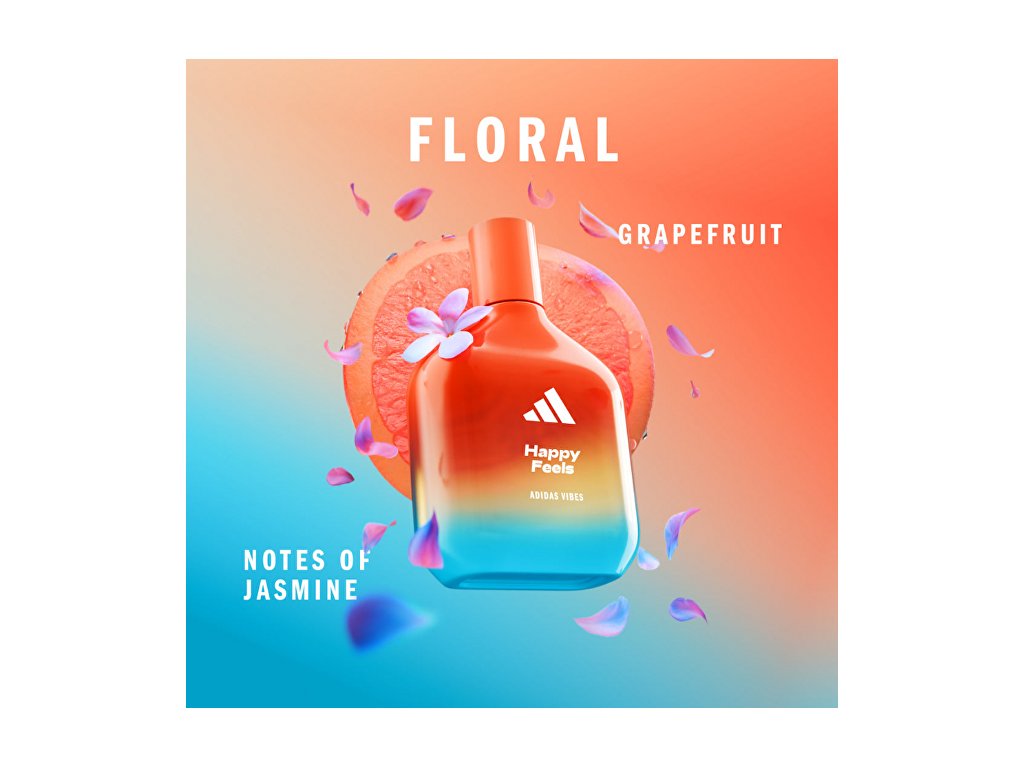 Happy Feels od značky Adidas je svěží a optimistická vůně pro ženy i muže, která v sobě nese radost z přítomného okamžiku. Tato novinka z roku 2024 vznikla pod vedením talentované parfumérky Marypierre Julien a je jako stvořená pro dny, kdy chcete rozdávat dobrou náladu. Úvod vůně rozjasňuje šťavnatý grapefruit, který probouzí smysly svou jiskřivou svěžestí. V srdci se rozvíjí elegantní jasmín, jenž celé vůni propůjčuje lehkost, čistotu a příjemně pozitivní charakter. Růžový pepř dodává kompozici jemně kořeněný náboj a moderní šmrnc. Happy Feels je ideální volbou pro každodenní nošení – lehká, hravá a plná dobré energie.Typ - Parfémová voda