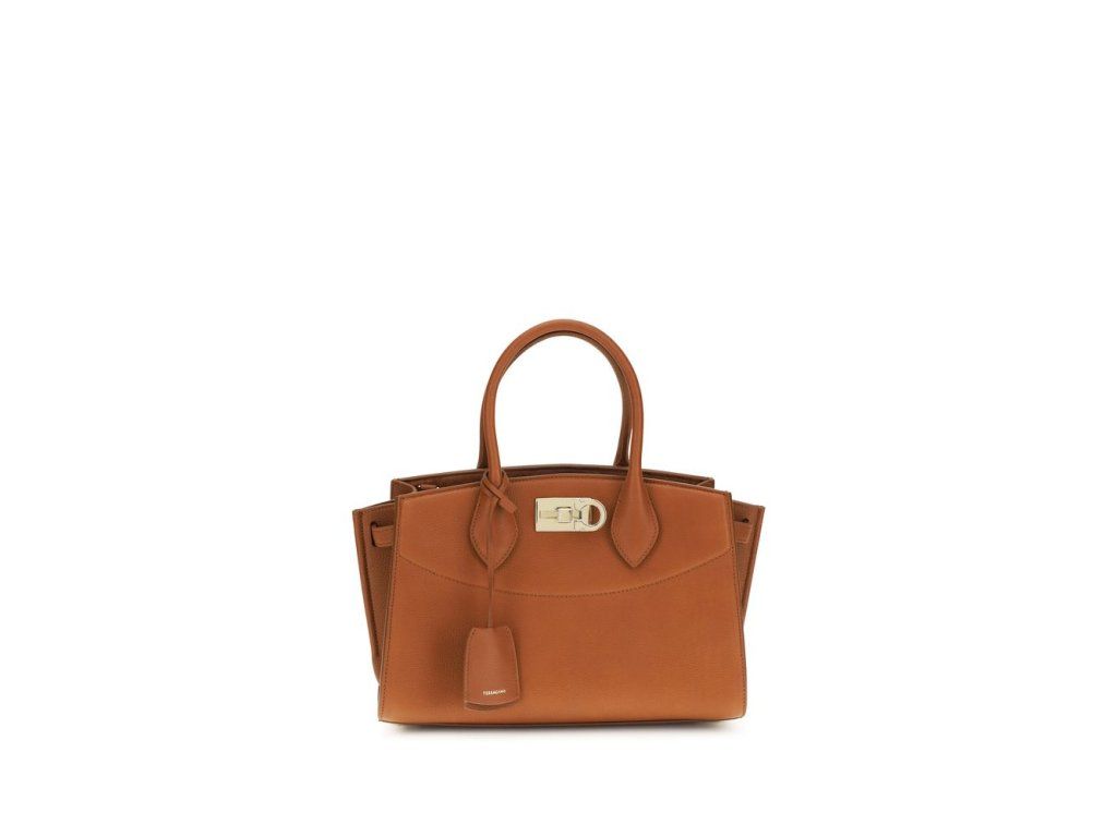 The New Ferragamo Studio Handbag by Ferragamo, part of the Ferragamo Studio collection, stands out for its geometric shapes and functionality designed for the contemporary woman. The rounded stitching recalls the house’s iconic lines, as does the Gancini slider closure. Lined in suede and featuprsten a double internal compartpánskýt, it features top handles and an adjustable, removable shoulder strap for elegant and modern versatility.