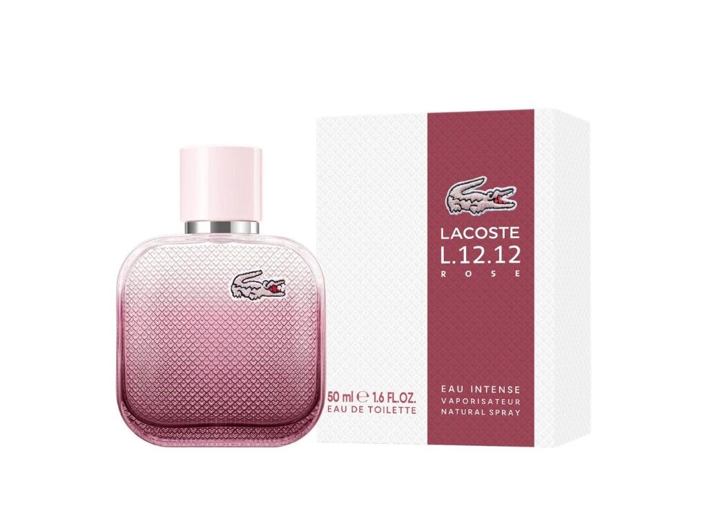 Lacoste L.12.12. Rose Eau Intense je květinová toaletní voda pro ženy. Okouzlující, intenzivní, nespoutaná – ale i něžná a velmi ženská. Taková je toaletní voda, která se otevírá impozantním spojením pikantního černého pepře s jemným bílým čajem a svěží mandarinkou. Květ bavlníku se v srdci snoubí s opulentním kosatcem a smyslnou růží. Kompozici uzavírá dřevité spojení santalového a cedrového dřeva, doplněné o smyslnou kapku pižma. Vůně byla uvedena na trh v roce 2023 a vytvořily ji Caroline Dumur a Fanny Bal.Toaletní voda dokonale ladí s pánskou verzí Lacoste L.12.12. Blanc Eau Intense.Hlavní vůně - Květinová