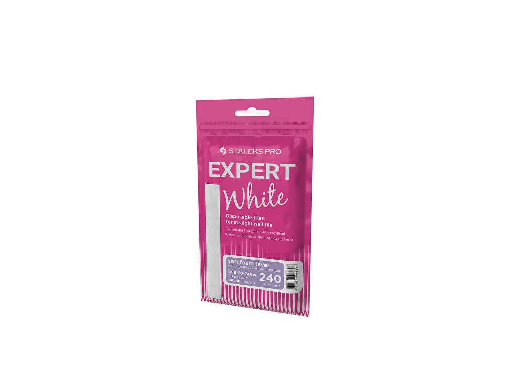 Lepicí jednorázové pilníky Expert White s tenkou vrstvou pěny jsou ideální pro jemné leštění a pilování přírodních i umělých nehtů, a to při přípravě na aplikaci nátěrů. Pěnová vrstva pomáhá snižovat tlak na nehtovou ploténku, čímž zvyšuje komfort při práci. Vysoce kvalitní abrazivní povrch Expert White si dlouhodobě udržuje své vlastnosti a speciální povrchová úprava zabraňuje ucpávání abraziva organickým prachem. Estetická bílá barva pilníku přispívá k profesionálnímu vzhledu při práci.Doplňkové parametry