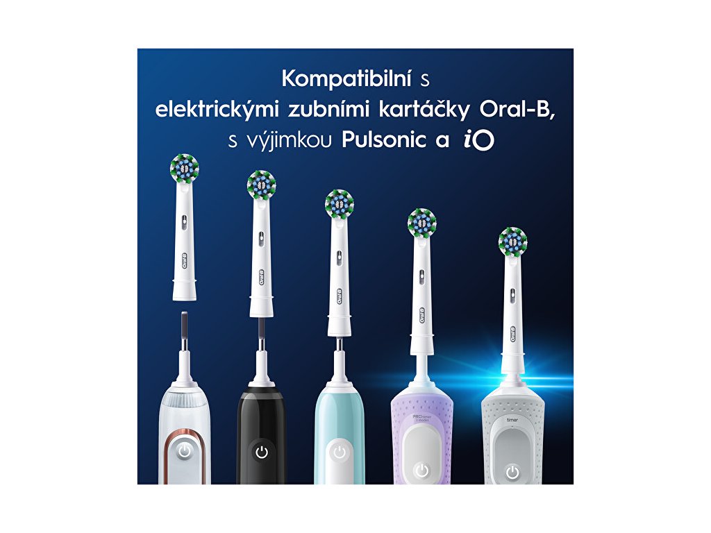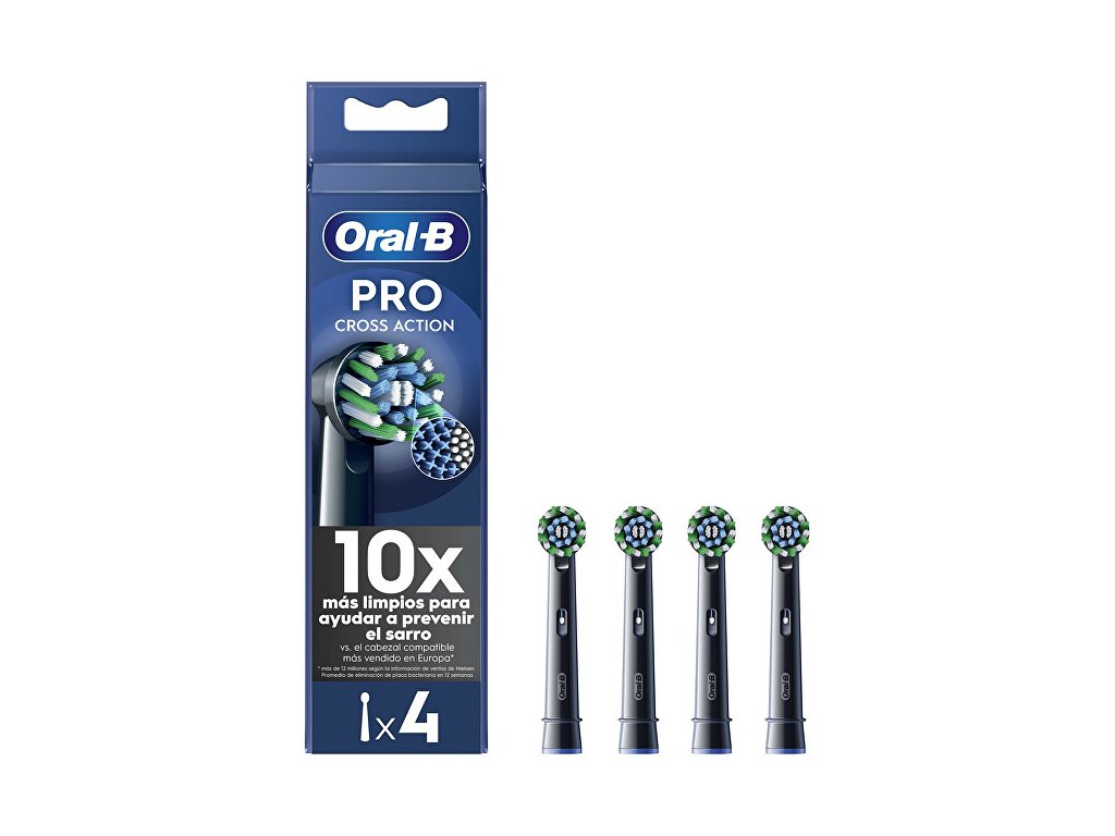Kartáčková hlava Oral-B Pro Cross Action v černé barvě má více než 2200 dokonale zkosených vláken, která v porovnání s manuálním zubním kartáčkem odstraňují až o 100 % více bakteriálního zubního plaku a zajišťují čistší zuby a zdravější dásně. Originální kartáčkové hlavy Oral-B jsou navrženy s novými vlákny ve tvaru X, která čistí v místech, kam kulaté hlavy nedosáhnou. Ukazatel opotřebení kartáčkové hlavy změní vlákna ze zelené barvy na žlutou a ukazuje tak, kdy je hlavu nutné vyměnit pro 100% účinnost čištění. Zaručená kompatibilita se všemi dobíjecími zubními kartáčky Oral-B, s výjimkou zubních kartáčků Pulsonic a iO.Doplňkové parametry