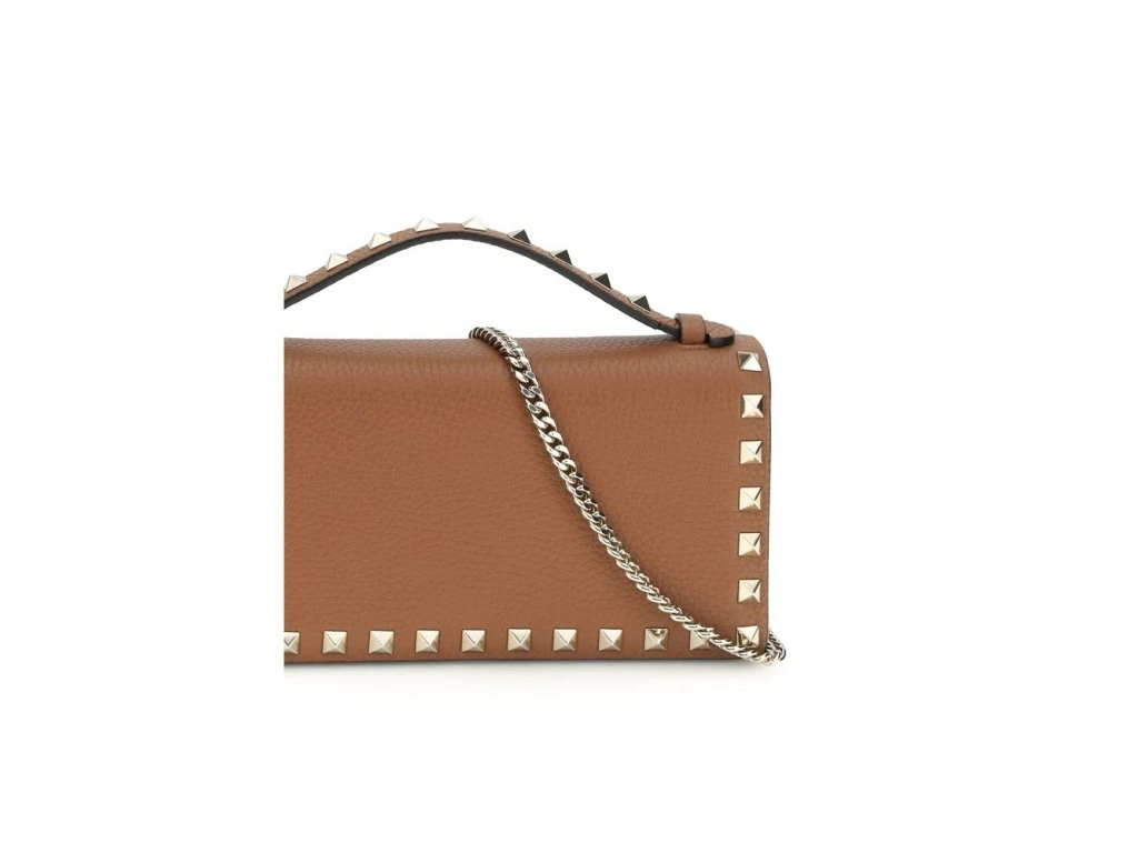 The Rockstud chain Wallet by Valentino Garavani combines practicality and iconic style thanks to the studs and metallic parts with Platinum finish, which enhance its distinctive character. The magnetic button closure ensures easy and immediate opening, while the interior offers a zippered wall pocket and card compartpánskýt, ideal for organizing essentials. Nappa leather lining adds a touch of softness and luxury, making this an elegant and functional accessory for any occasion.