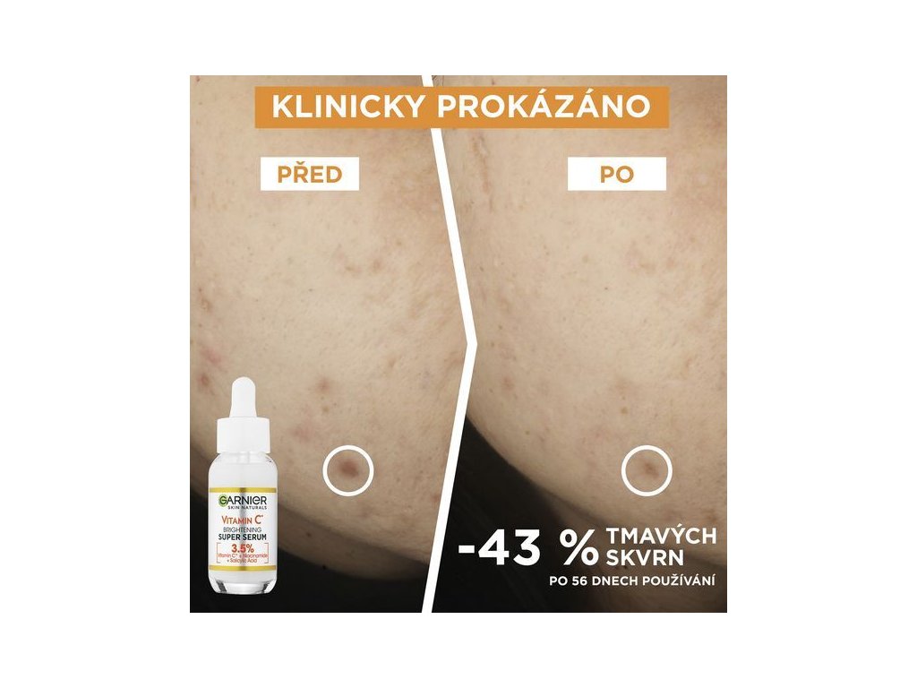 První sérum od Garnier s 4 % komplexu látek s intenzivním efektem na pokožku (vitamin C, niacinamid, a kyselina salicylová) pro snížení viditelnosti pigmentových skvrn již za 6 dní a podporu tvorby kolagenu pro hladší pleť.Doplňkové parametry