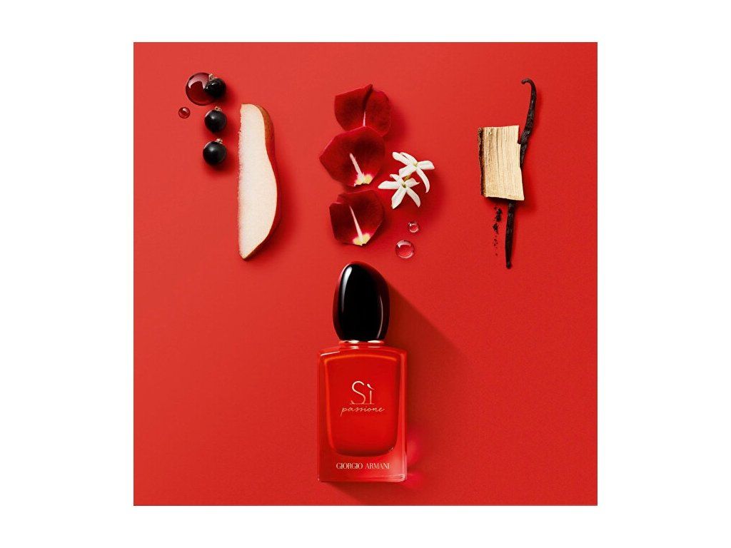 Giorgio Armani Sì Passione je smyslná a sebevědomá interpretace ikonické vůně Sì z roku 2013. Tato edice, představená v prosinci 2017 a ztělesněná herečkou Cate Blanchett, vyjadřuje vášeň, sílu a nezávislého ducha moderní ženy – ženy, která se nebojí říct své odvážné „ano“. Vůně se otevírá energickým a jiskřivým spojením šťavnaté hrušky, výrazného černého rybízu, růžového pepře a osvěžujícího grapefruitu, které působí jako nával adrenalinu. V srdci rozkvétá smyslná kombinace ananasu, růže, jasmínu a hebkého heliotropu, jež dodávají kompozici ženskost, hloubku a návykový charakter. Základ vůně patří hřejivé vanilce, elegantnímu cedrovému dřevu, pačuli a modernímu ambrovému dřevu, které vytvářejí dlouhotrvající, svůdnou stopu plnou sebejistoty – stejně výraznou, jako je efekt dokonale červené rtěnky. Sì Passione je intenzivní, zářivá a vášnivá vůně pro sebevědomé ženy, které chtějí podtrhnout svou vnitřní sílu, eleganci a přirozenou přitažlivost. Vůně Giorgio Armani Sì Passione je dostupná také v novém balení. Složení vůně zůstává stejné.Hlavní vůně - Květinová