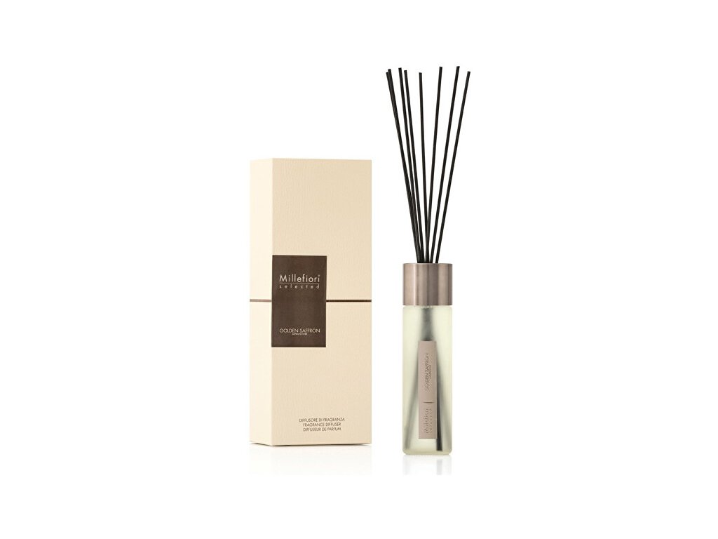 Skleněný difuzér Selected Zlatý šafrán má vůni exotického koření a dřevité tóny zvýrazňují charakteristické aroma zlatého šafránu, který dodává vůni luxusní rafinovanost. Složení vůně: hlava: čerstvé lístky máty, muškátová šalvěj, kardamon,srdce: černý pepř, zlatý šafrán, guaiacové dřevo,základ: pačuli, orientální pižmo, santálové dřevo.Doplňkové parametry