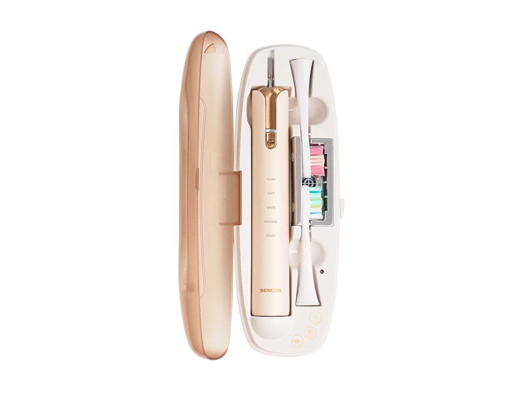 Sonický zubní kartáček Sencor SOC 4111GD nabízí profesionální péči o ústní dutinu v elegantním provedení. Disponuje 5 přednastavenými režimy pro čištění a regeneraci, přičemž dosahuje až 40 000 kmitů za minutu. Díky této technologii dokáže odstranit plak několikanásobně účinněji než běžné manuální čištění. Speciální kmitání je navrženo tak, aby zároveň pečovalo o zdraví vašich dásní. Chytrý časovač s technologií Quadpacer rozděluje čištění do čtyř rovnoměrných bloků pro maximální efektivitu. LED indikátor vás informuje o stavu baterie a ergonomická rukojeť zajišťuje pohodlnou manipulaci. Kartáček má velmi nízkou spotřebu energie a je voděodolný podle standardu IPX7, což znamená, že jej lze bezpečně používat i ve sprše. Výdrž baterie dosahuje až 45 dní při běžném každodenním použití. Výměnné kartáčkové hlavice zajišťují dlouhodobou hygienu a celosvětová kompatibilita napájení 100–240 V umožňuje bezproblémové použití kdekoli na světě. Balení obsahuje tělo kartáčku, dvě hlavice, indukční nabíječku, skleničku a přenosné pouzdro s USB konektorem a UV sterilizátorem. Pouzdro pojme jedno tělo kartáčku a buď dvě hlavice, nebo jednu hlavici a jednu zubní pastu.Doplňkové parametry