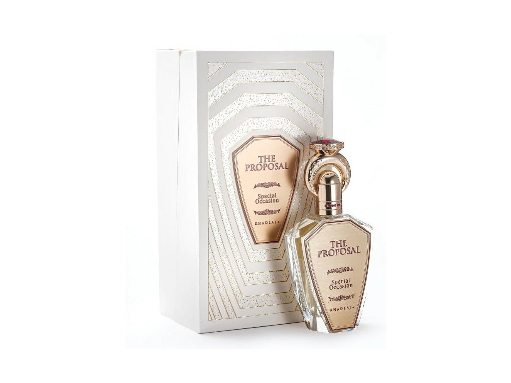 The Proposal Special Occasion od značky Khadlaj je květinově-ovocná parfémovaná voda pro ženy. Vydejte se na lákavé dobrodružství s vůní, která oslavuje vášeň, přitažlivost a eleganci. Sladký půvab broskve se snoubí s elegancí jasmínu a otevírá cestu nečekaným okamžikům. Jejich kouzlo umocní lahodná malina, která je doplněna o zemitou krásu pačuli. Základ je harmonickou symfonií v podobě smyslného pižma, ambry a opulentního kosatce. Vůně je perfektním společníkem pro všechny výjimečné příležitosti, kdy chcete zazářit. Díky vůni The Proposal Special Occasion bude každý okamžik zcela nezapomenutelný.Hlavní vůně - Květinová
