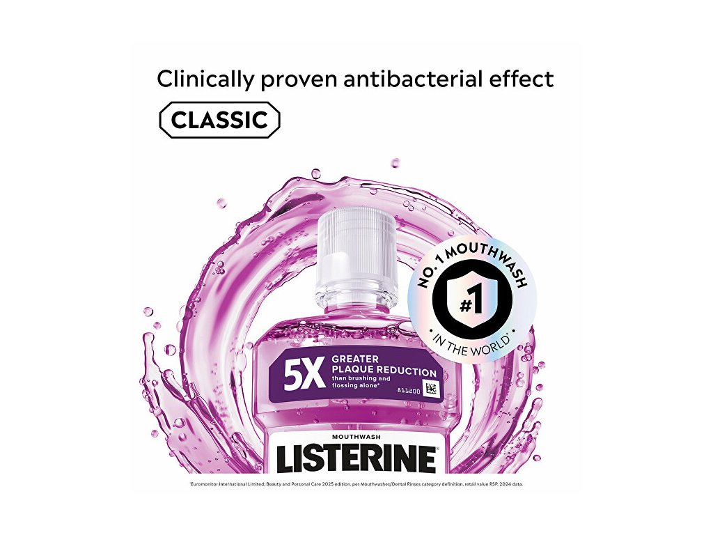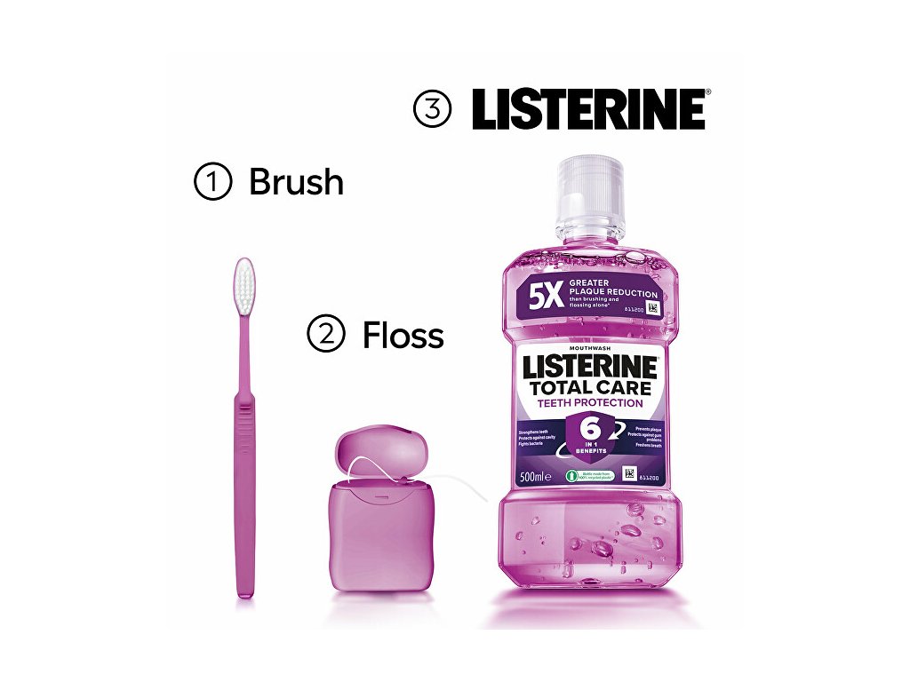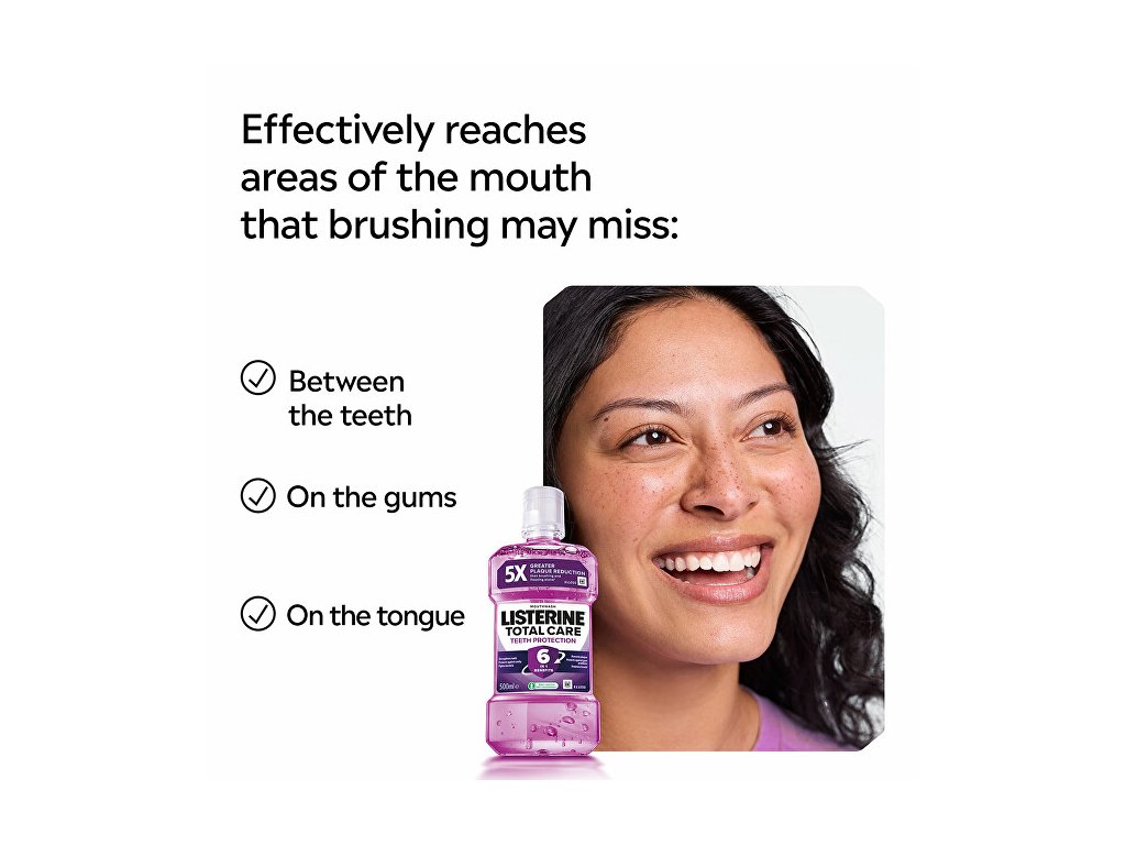 Při použití dvakrát denně LISTERINE® odstraňuje bakterie, které v ústech zůstávají po čištění zubů. Bylo prokázáno, že LISTERINE® zlepšuje vaši ústní hygienu a účinkuje v místech, které jsou zubním kartáčkem obtížně dosažitelné. Zároveň také omezuje a předchází tvorbě zubního plaku, jedné z hlavních příčin problémů s dásněmi, a osvěží váš dech.