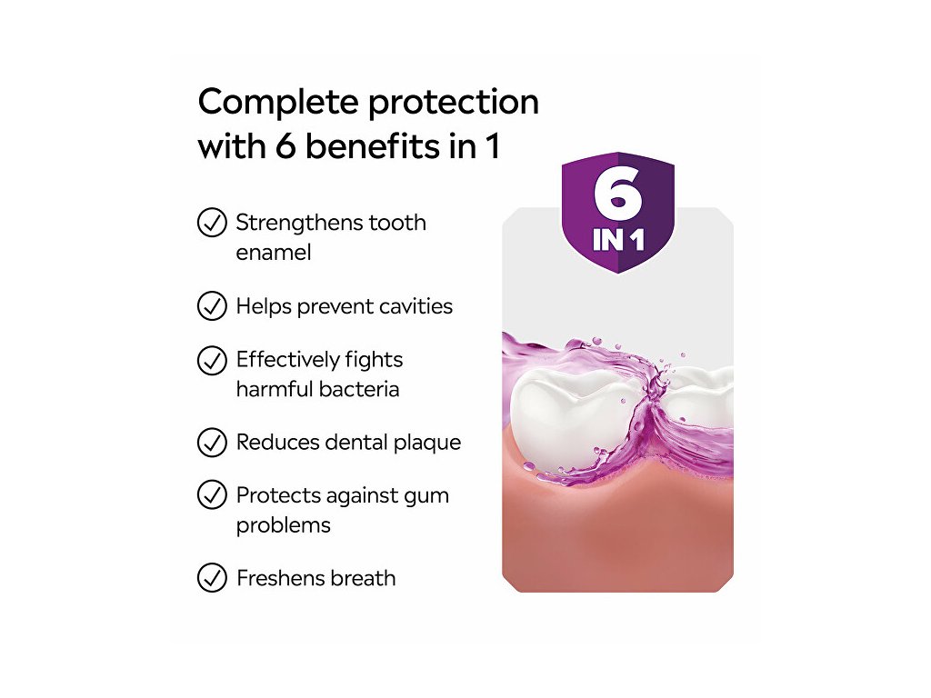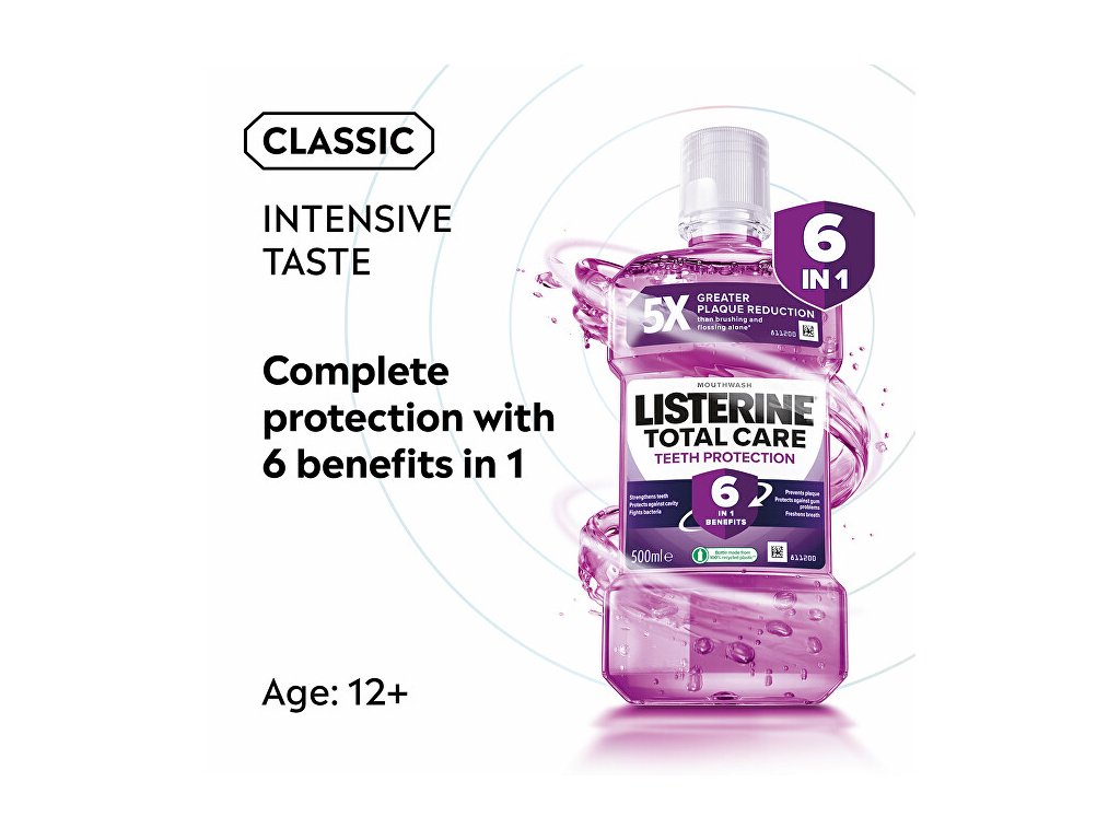 Ústní voda LISTERINE® TOTAL CARE Teeth Protection při používání dvakrát denně zlepšuje ústní hygienu díky kompletnímu 6násobnému účinku. LISTERINE® má antibakteriální účinek - klinicky prokázaný. Zároveň ústní flóra zůstává v rovnováze.Doplňkové parametry
