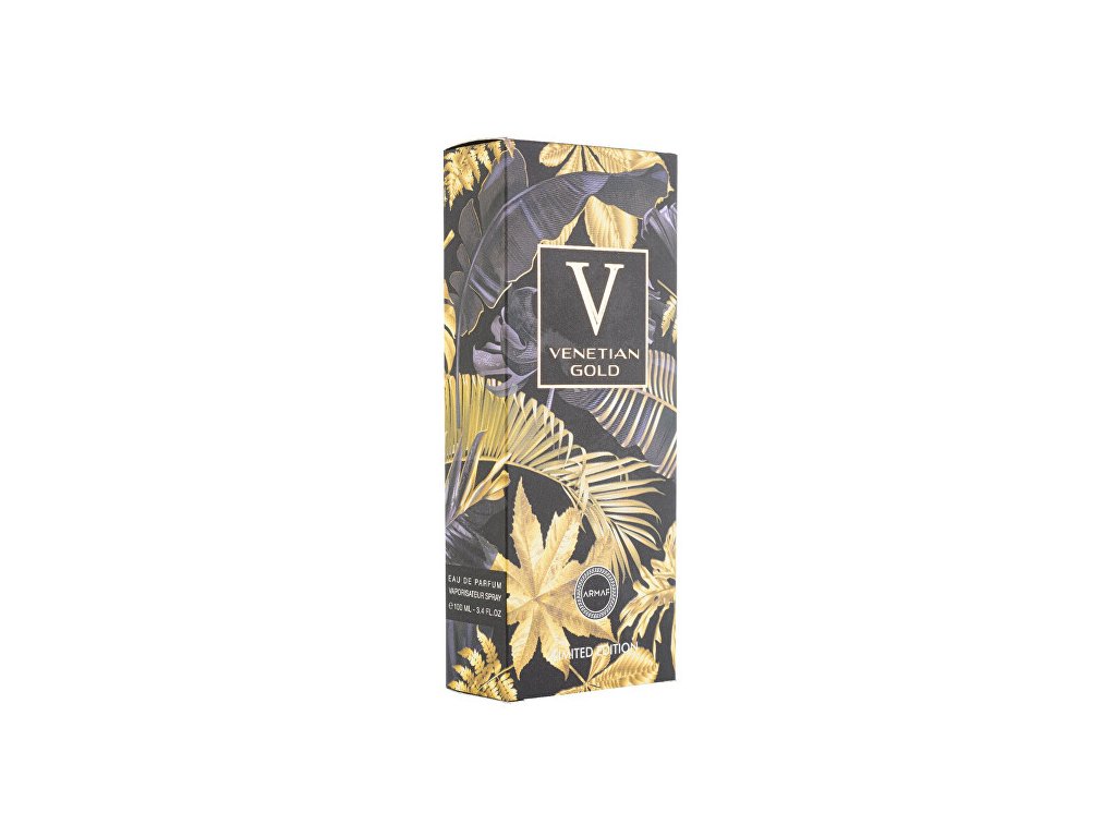 Venetian Gold od značky Armaf je dřevitá pižmová parfémová voda. Již první tóny vás zcela pohltí díky neodolatelné kombinaci svěžího bergamotu, tropických tónů mučenky a jemných odstínů růže. Na úvod plynule navazuje vůně šťavnatého exotického ovoce. Díky svěžímu tymiánu a intenzivním tónům cedrového listu na vás dýchne atmosféra Středomoří, jehož energie vás bude následovat kamkoli se vydáte, stejně jako tato jedinečná vůně, v jejímž základu se snoubí luxusní ingredience: živočišné a dlouhotrvající pižmo, zemité pačuli, exotické santalové dřevo a smyslný kašmír. Tato vůně oslavuje krásu a bohatství jednoho z nejznámějších italských měst - přeneste se díky této vůni do Benátek! Vůně byla uvedena na trh v roce 2022.Hlavní vůně - Citrusová
