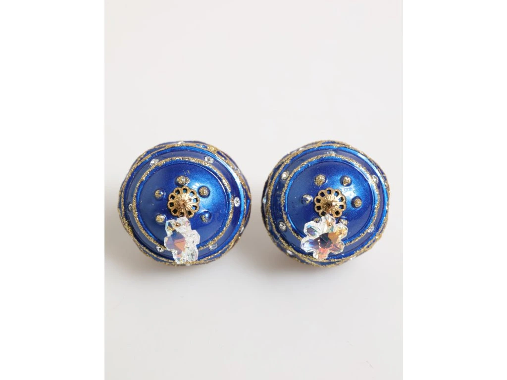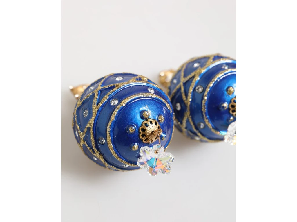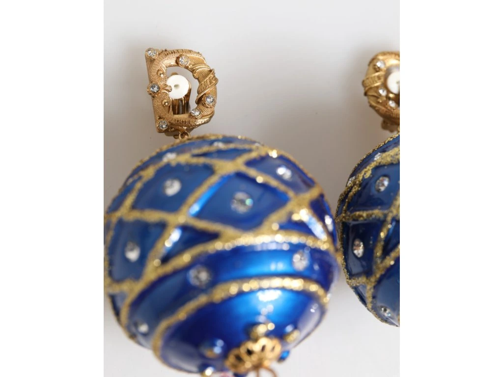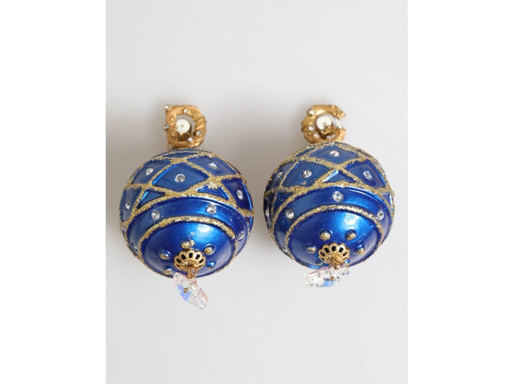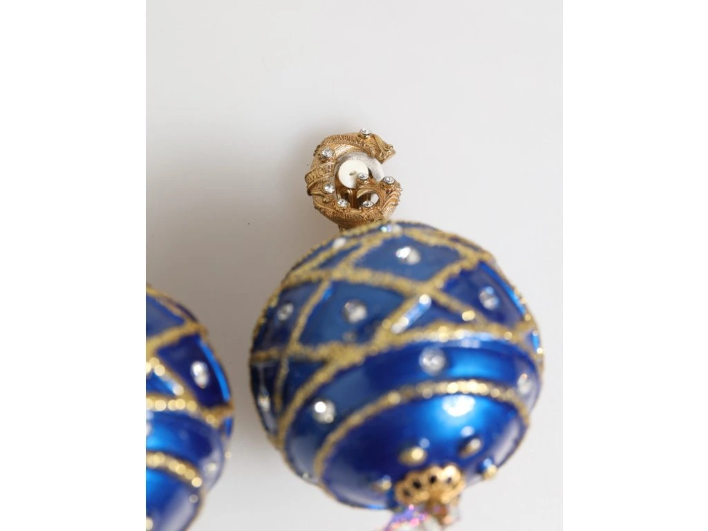 \nNádherné zbrusu nové se štítky, 100% autentické mosazné krystaly Dolce & Gabbana vánoční koule na náušnicích. Vykládané čirými a bílými krystaly. Tyto odvážné statepánské náušnice jsou navrženy jako třpytivé vánoční koule ornapánskéts v zářivě modrém smaltu s detaily se zlatými třpytivými vzory a křišťálovými ozdobami. Dokončeno s připínacími hřbety a visícími slznými krystaly pro větší sváteční kouzlo.