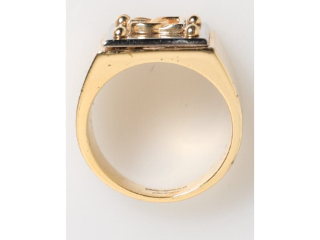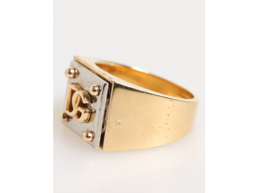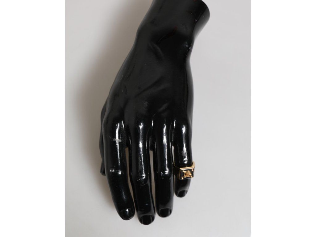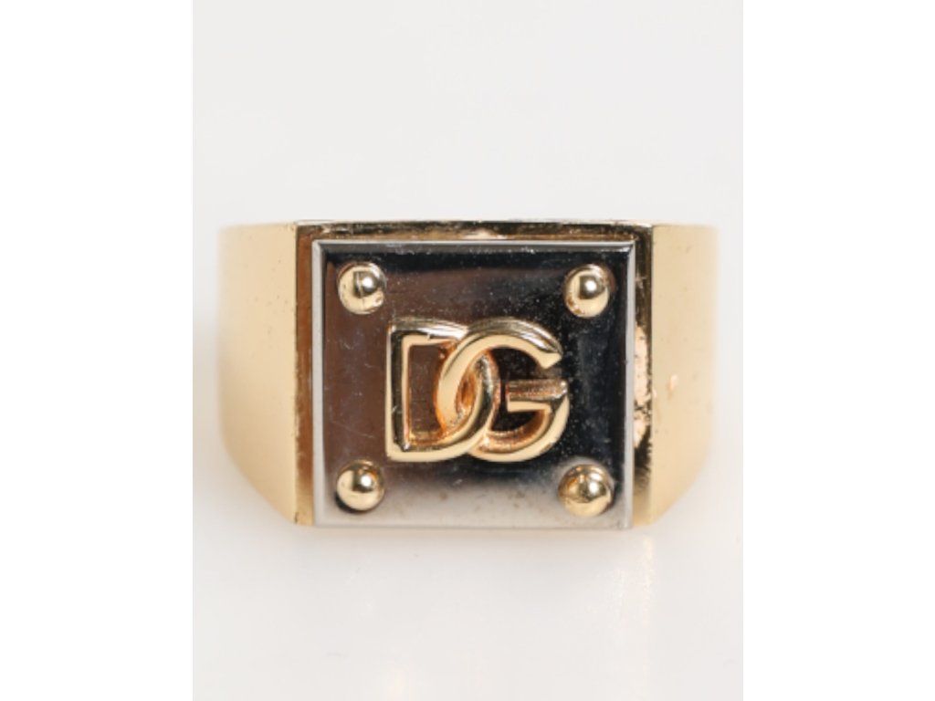 \nNádherný zbrusu nový, 100% autentický pečetní prsten Dolce & Gabbana, hranatý čtvercový obličej s vyvýšeným logem DG a rohovými detaily ve stylu cvočků. Povrchová úprava ve zlatém tónu v kombinaci s vysoce lesklým černým pozadím vytváří výrazný kontrast, který ztělesňuje luxus a sebevědomí.